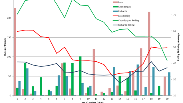 Now you can see that because of the large number of not-out innings, Chanderpaul had a rolling average up near 80 at the start of the last year he played. But it did start to trend downwards, around 50 in his fourteenth and fifteenth innings, and his last century was his ninth innings of the twenty. But considering his efforts for WI, they could have given him more time to see if he could have worked his way out of the slump. The only caveat was his age, which was approaching 41.